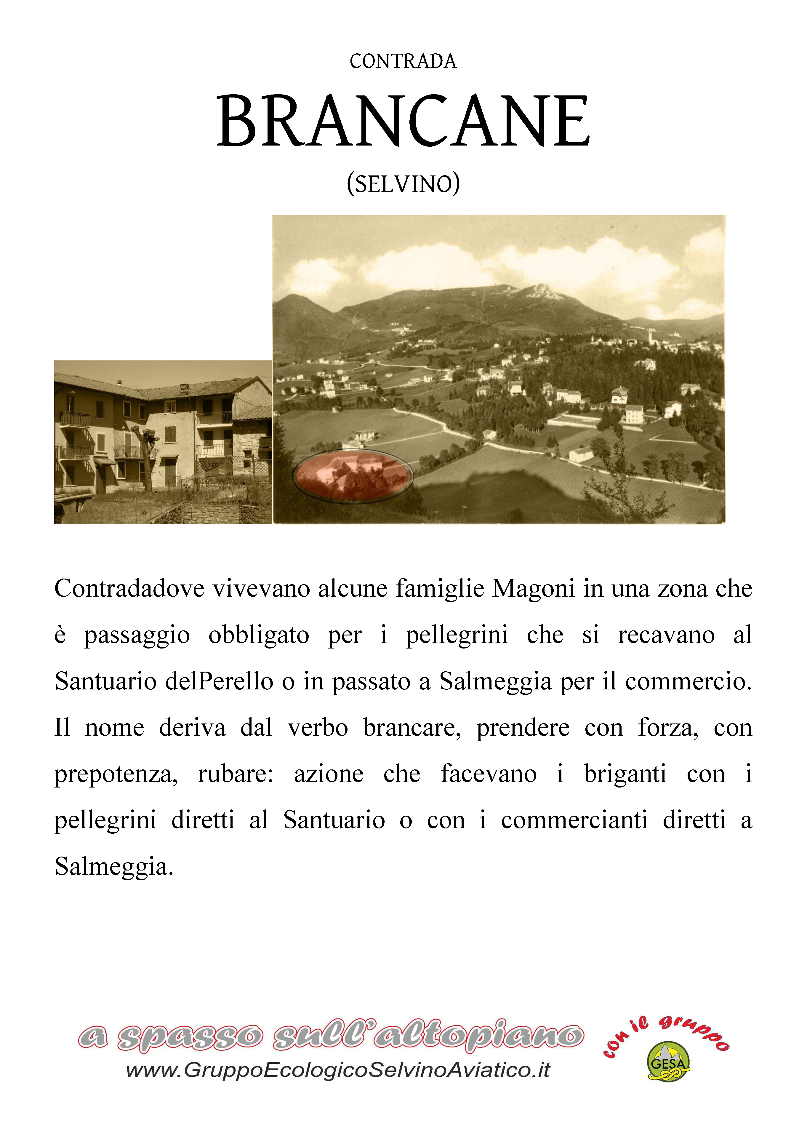 Il nome deriva dal verbo brancare, prendere con forza, con prepotenza, rubare: azione che facevano i briganti con i pellegrini diretti al Santuario o con i commercianti diretti a Salmeggia.