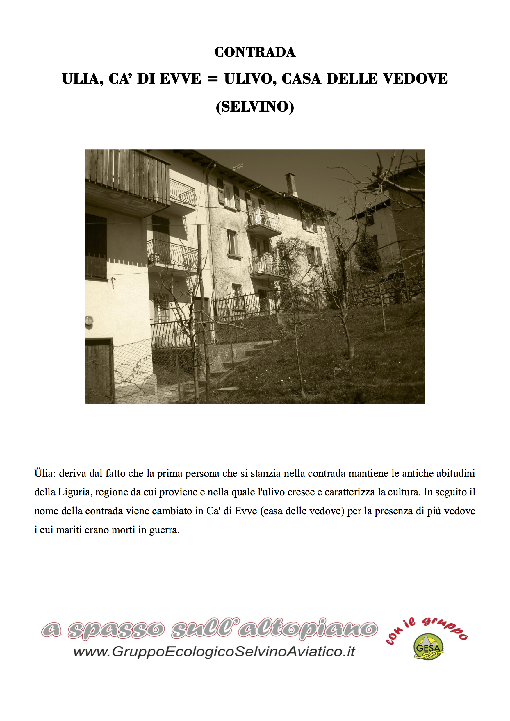 In seguito il nome della contrada viene cambiato in Ca' di Evve — casa delle vedove — per la presenza di più vedove i cui mariti erano morti in guerra.